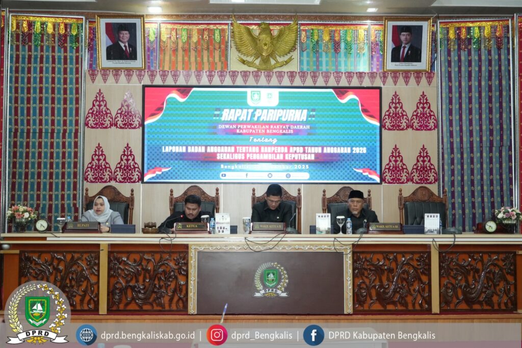 Bengkalis, Humas DPRD – DPRD Kabupaten Bengkalis melaksanakan Rapat Paripurna Laporan Badan Anggaran tentang Ranperda APBD Tahun Anggaran 2026 sekaligus pengambilan keputusan. Rapat yang dipimpin langsung oleh Ketua DPRD Bengkalis Septian Nugraha ini digelar di Lantai II Gedung DPRD, Rabu (26/11/2025).